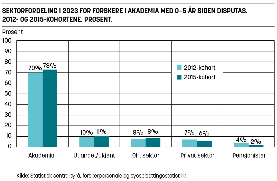 For øvrig finner vi at akademia er en svært stabil sektor. 64 prosent av 2012-kohorten og 72 prosent av 2015-kohorten er fortsatt i akademia i 2023. Stabiliteten øker jo lenger det er siden disputas.